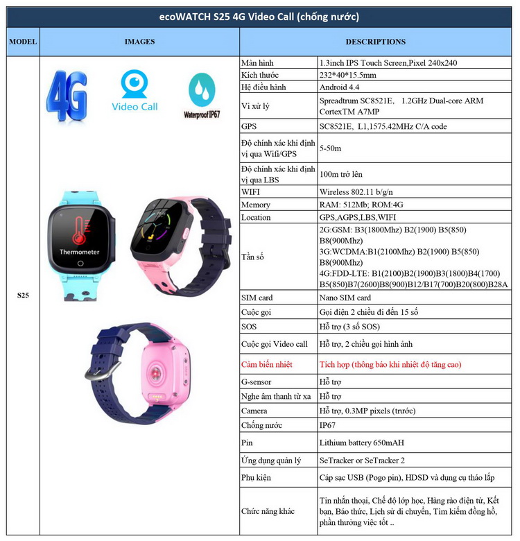 Đặc điểm nổi bật của ecoWATCH S25 4G Video Call (chống nước)