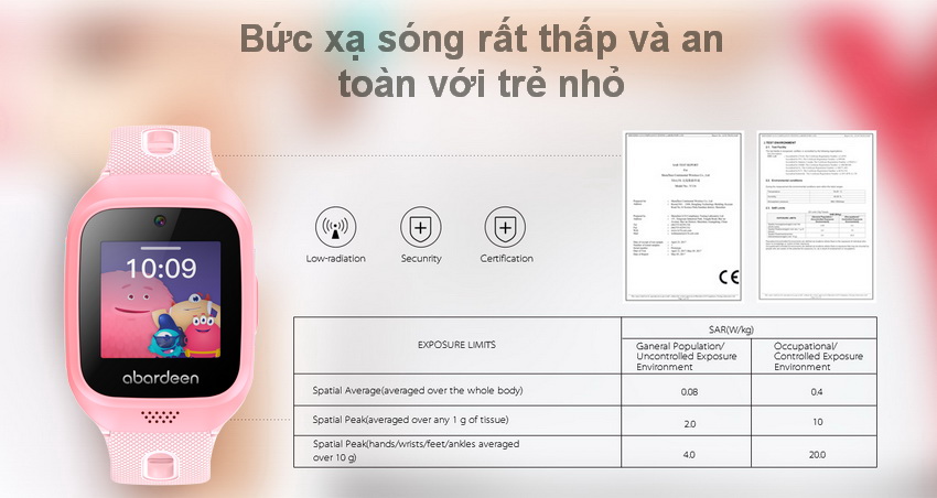 Bức Xạ Cực Thấp: Abardeen N200 (chống nước IP67) có tiêu chuẩn về bức xạ thấp hơn rất nhiều so với tiêu chuẩn tại Châu Âu cho phép, có thể khẳng định đồng hồ định vị abardeen N200 là sản phẩm an toàn với trẻ em. Các bậc cha mẹ có thể yên tâm khi con đeo đồng hồ định vị này cả ngày đến trường.