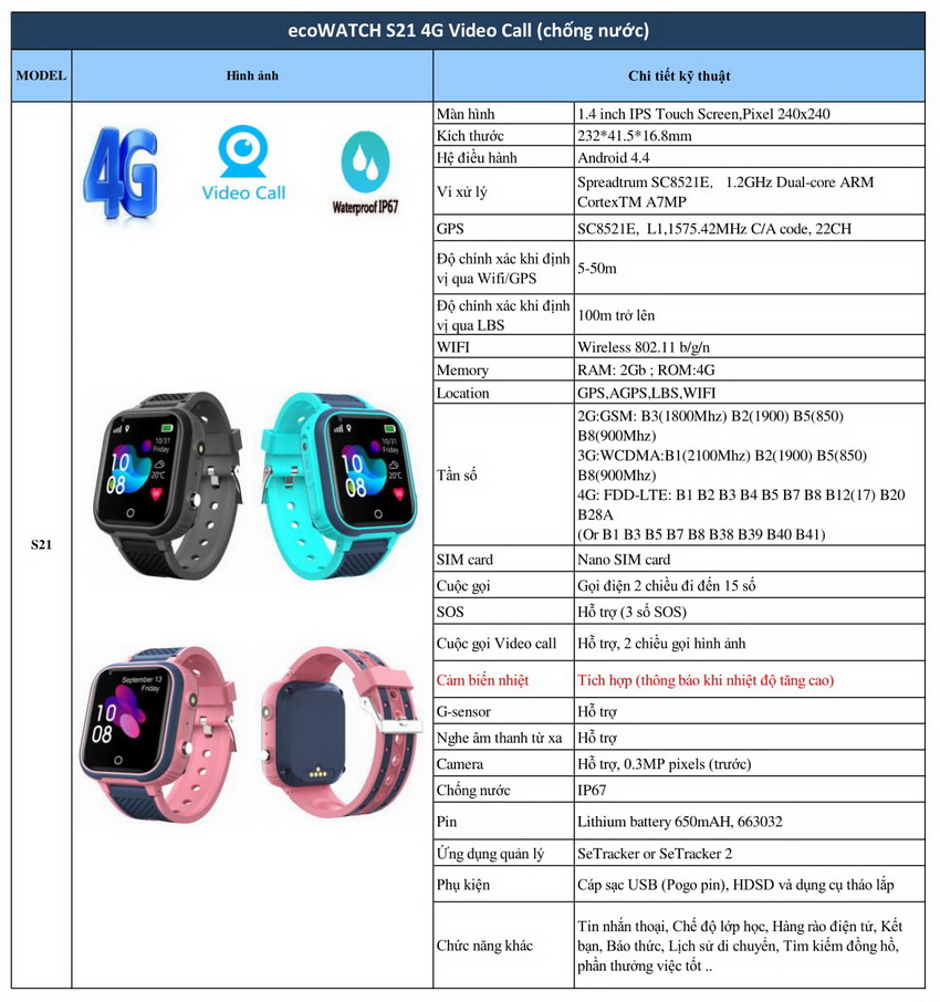 Đặc điểm nổi bật của ecoWATCH S21 4G Video Call (chống nước)